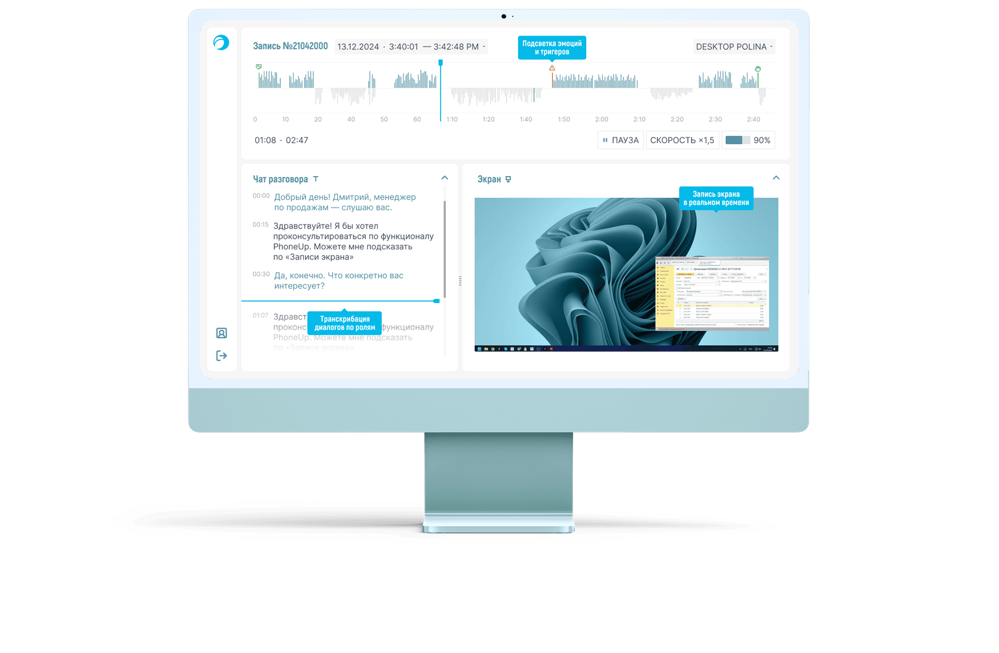 Смотрите записи экранов сотрудника во время звонка синхронно с расшифровкой разговоров